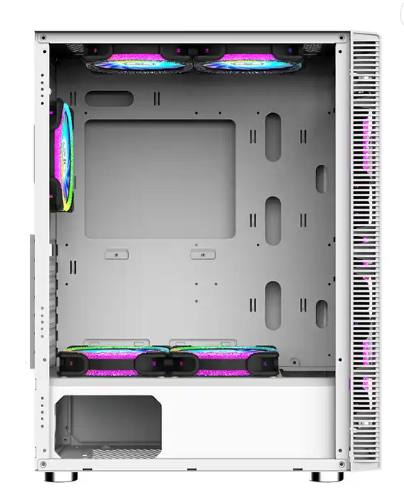 La puerta del gabinete se presenta como una ventana futurista, tras la cual se vislumbra la sinfonía de luces y circuitos que componen el corazón de la máquina. El vidrio templado de la puerta permite a los entusiastas disfrutar del espectáculo de luces RGB, reflejando la energía pulsante del rendimiento interno.